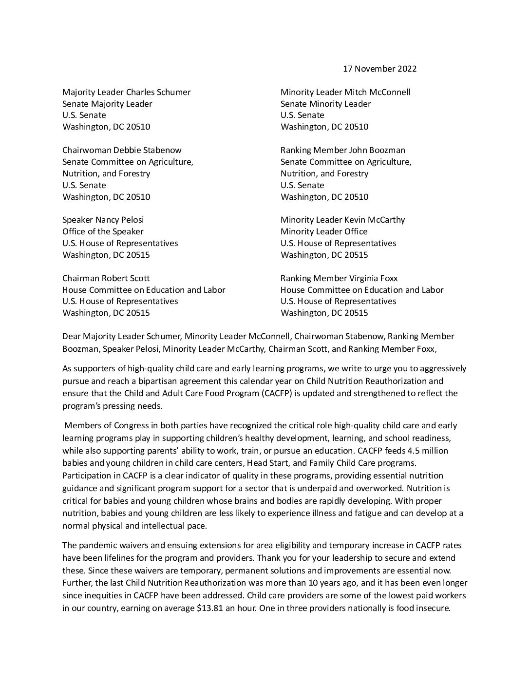 Letter urging Senate and House leadership to aggressively pursue and reach a bipartisan agreement on Child Nutrition Reauthorization and ensure that the Child and Adult Care Food Program (CACFP) is updated and strengthened to reflect the program’s pressing needs.