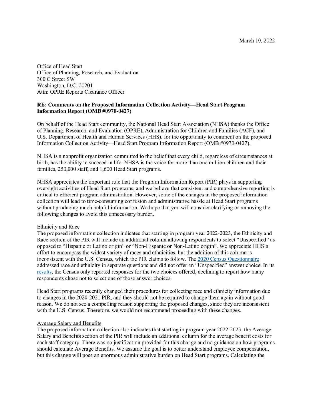 On March 10, 2022, NHSA submitted comments on the Proposed Information Collection Activity for the Head Start Program Information Report (OMB #0970-0427). NHSA appreciates the important role that the Program Information Report (PIR) plays in supporting oversight activities of Head Start programs and is advocating for two proposed changes to be clarifyied or removed.