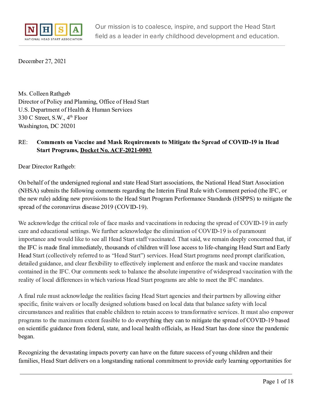 Response to the Interim Final Rule with Comments (IFC) on Vaccine and Mask Requirements to Mitigate the Spread of COVID-19 in Head Start Programs, Docket No. ACF-2021-0003. Submitted 12/27/2021.