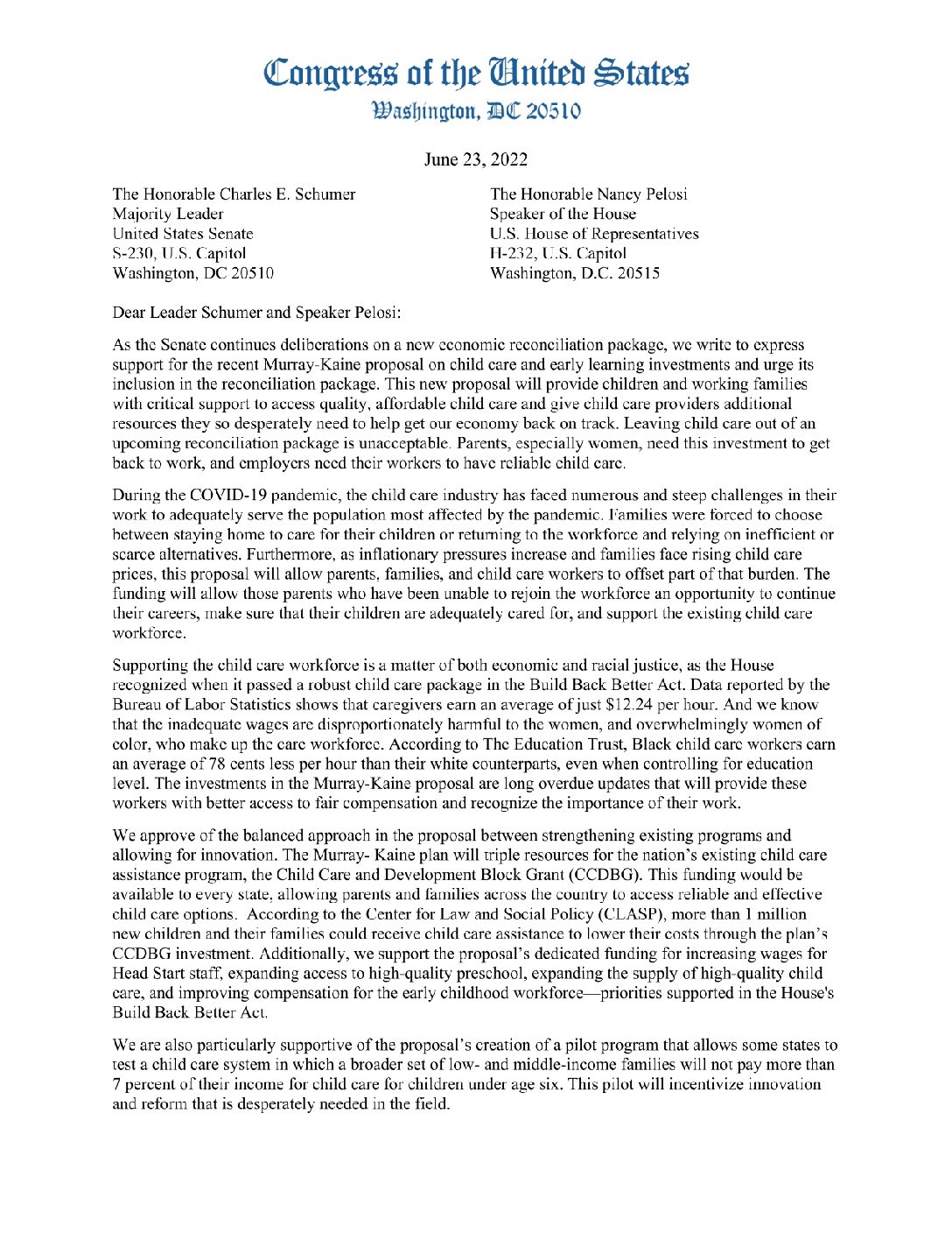 Signed by more than half of the House Democratic Caucus, the letter is co-led by Congressman Joaquin Castro (D-TX-20), founding co-chair of the Pre-K and Child Care Caucus; Congresswoman Chrissy Houlahan (D-PA-06); Congressman Jim Himes (D-CT-04), Chairman of the Select Committee on Economic Disparity Fairness and Growth; and Congressman Donald McEachin (D-VA-04).