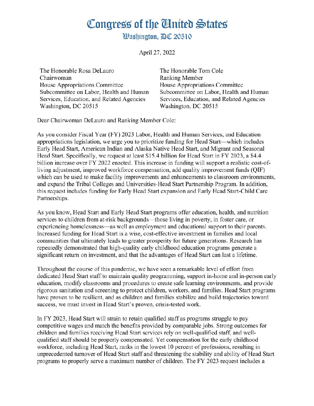 In total, 172 members of Congress, from both sides of the aisle, signed their support to increase the funding for America’s at-risk children and families by urging robust funding for Head Start and Early Head Start in fiscal year 2023 (FY23).