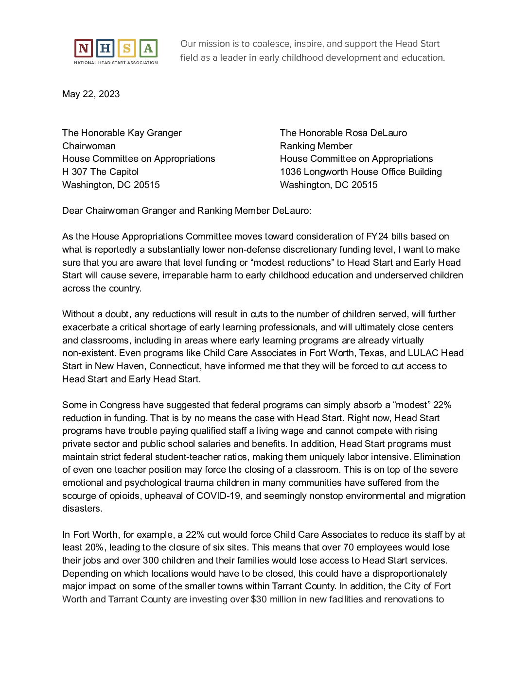 NHSA Executive Director Yasmina Vinci sent a letter to the House Committee on Appropriations, Chairwoman Kay Granger, and Ranking Member Rosa DeLauro, urging them to prioritize investments in Head Start.
