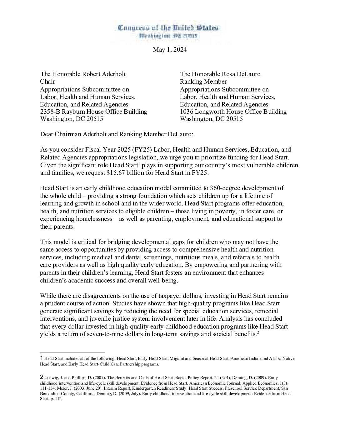 This sign-on letter, led by Rep. Jahana Hayes (D-CT), requests appropriations to prioritize and provide additional funding for Head Start in Fiscal Year 2025.