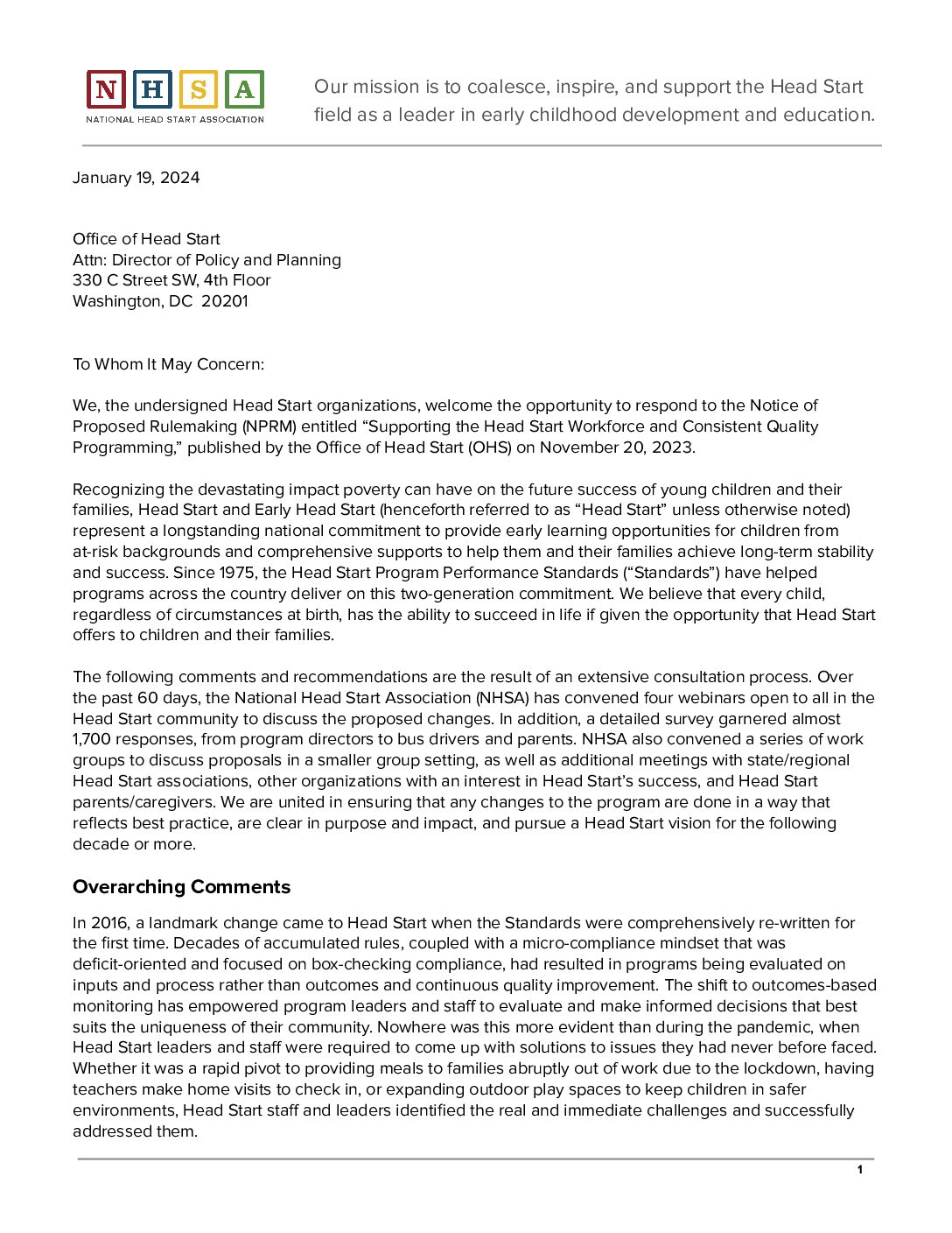 The National Head Start Association has submitted comments to the Office of Head Start (OHS) on behalf of nearly 1,000 Head Start and Early Head Start programs, all State, Regional, and National Head Start associations, and other Head Start-affiliated organizations and supporters on the Notice of Proposed Rulemaking (NPRM) entitled “Supporting the Head Start Workforce and Consistent Quality Programming,” published by the Office of Head Start (OHS) on November 20, 2023.