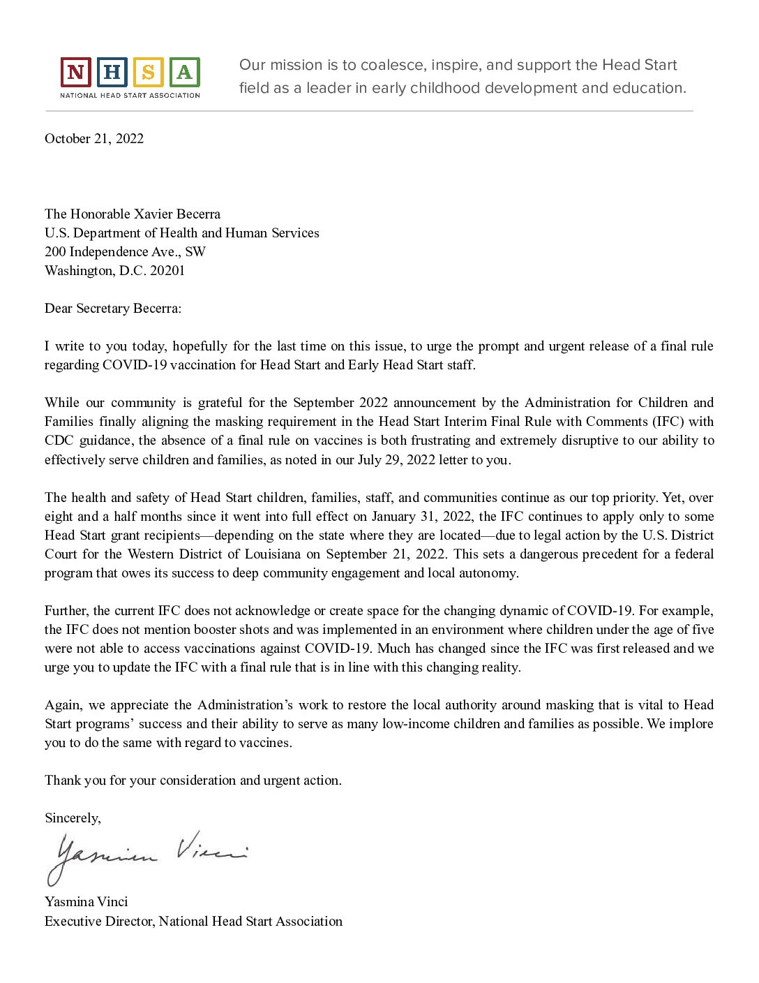NHSA wrote to Health and Human Services Secretary Becerra to urge the prompt and urgent release of a final rule regarding COVID-19 vaccination for Head Start and Early Head Start staff. While our community is grateful for the September 2022 announcement by the Administration for Children and Families finally aligning the masking requirement in the Head Start Interim Final Rule with Comments (IFC) with CDC guidance, a final rule on vaccines is necessary.