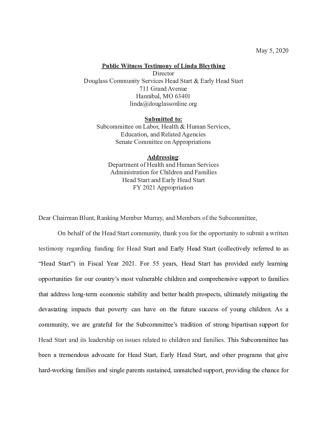Linda Bleything, director of the Douglass Community Services Head Start & Early Head Start in Hannibal, MO, submitted written testimony to the Senate Committee on Appropriations’ Subcommittee on Labor, Health & Human Services, Education, and Related Agencies regarding funding for Head Start and Early Head Start in Fiscal Year 2021.