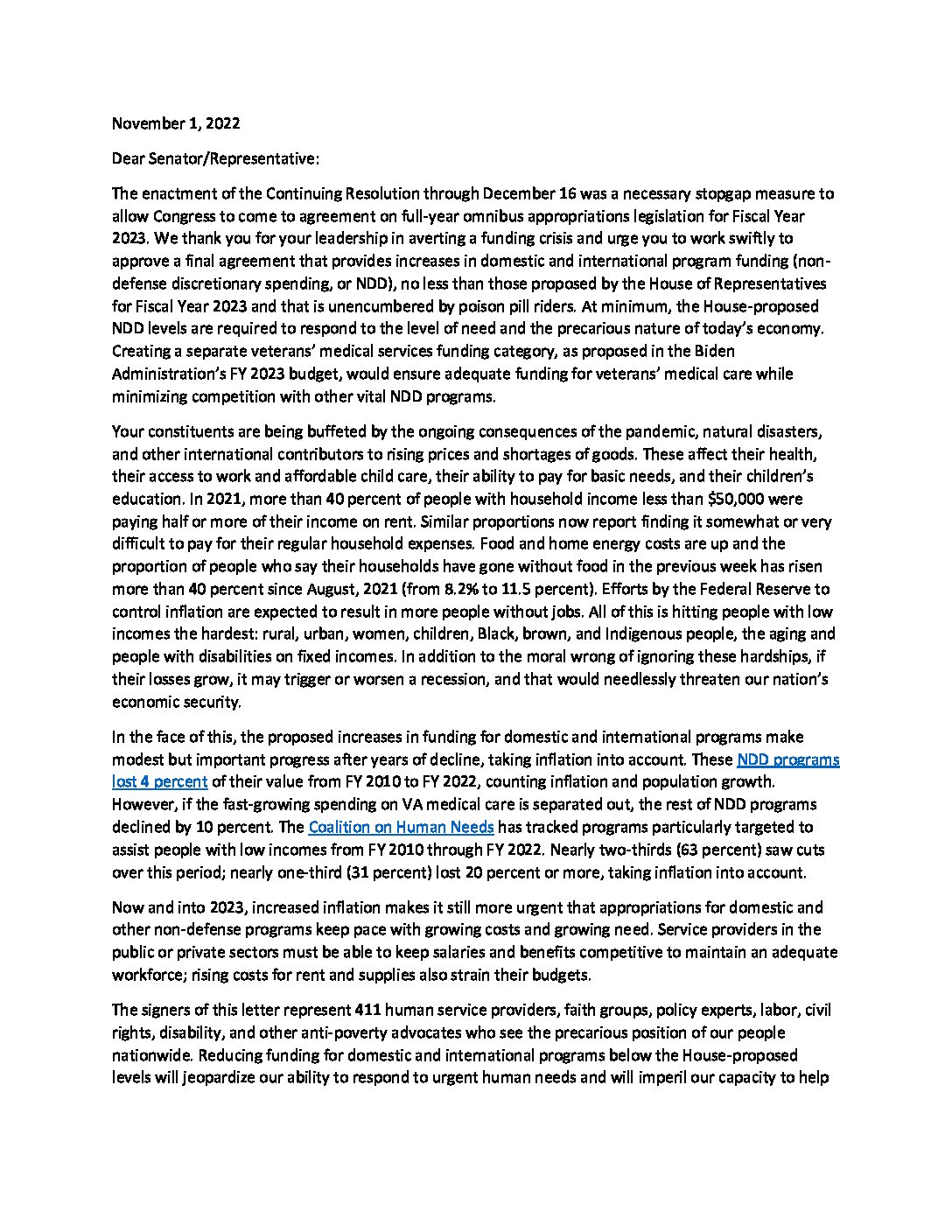 NHSA joined 410 organizations by signing-on to the Fiscal Year 2023 Omnibus Appropriations letter that the Coalition on Human Needs organized. This letter, sent to members of both the House of Representatives and the Senate, tells Congress to enact increases in domestic and international program funding.