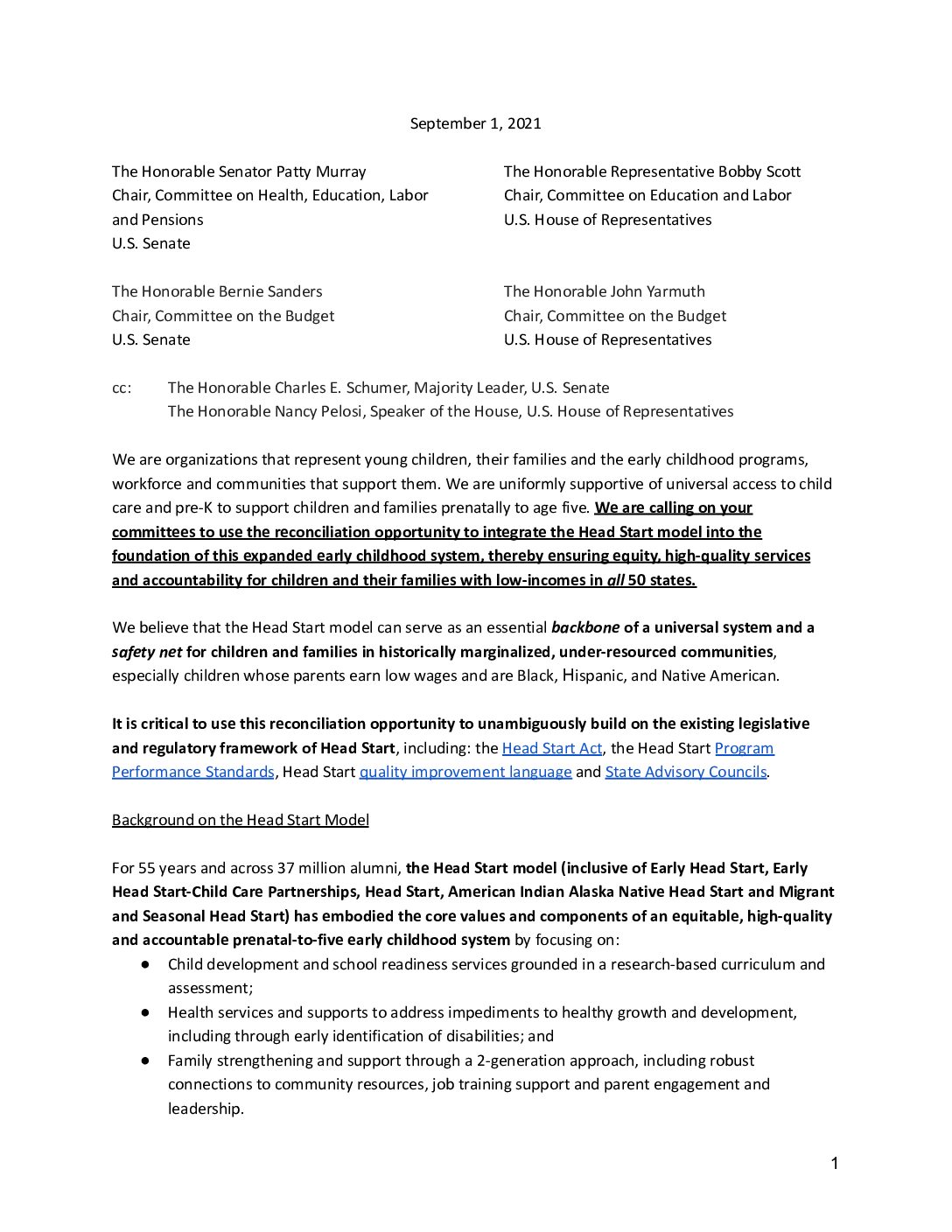 Coalition letter from organizations representing young children, their families and early childhood programs, workforce, and communities in support of universal access to child care and pre-K. Letter calls on Congress to use the reconciliation opportunity to integrate the Head Start model into the foundation of this expanded early childhood system, thereby ensuring equity, high-quality services and accountability for children and their families with low-incomes in all 50 states.