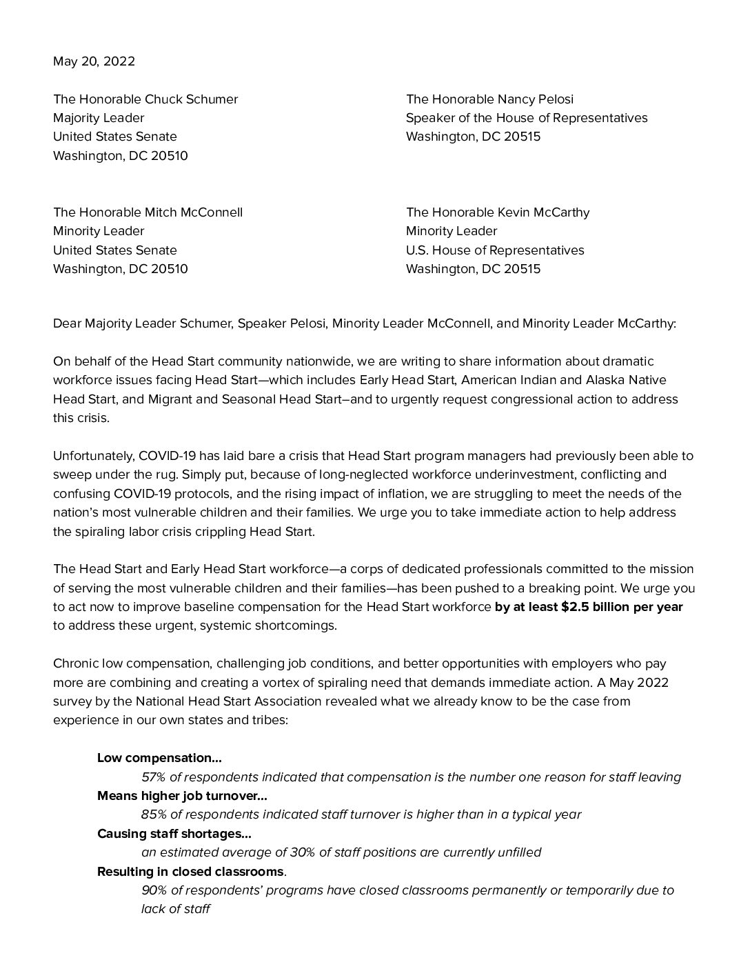 Following the release of the findings from an NHSA poll, the Head Start community sent a letter to congressional leadership signed by NHSA, all 50 state Head Start associations, and all 12 regional and national Head Start associations. The letter urged Congress to boost compensation for the workforce by at least $2.5 billion per year.