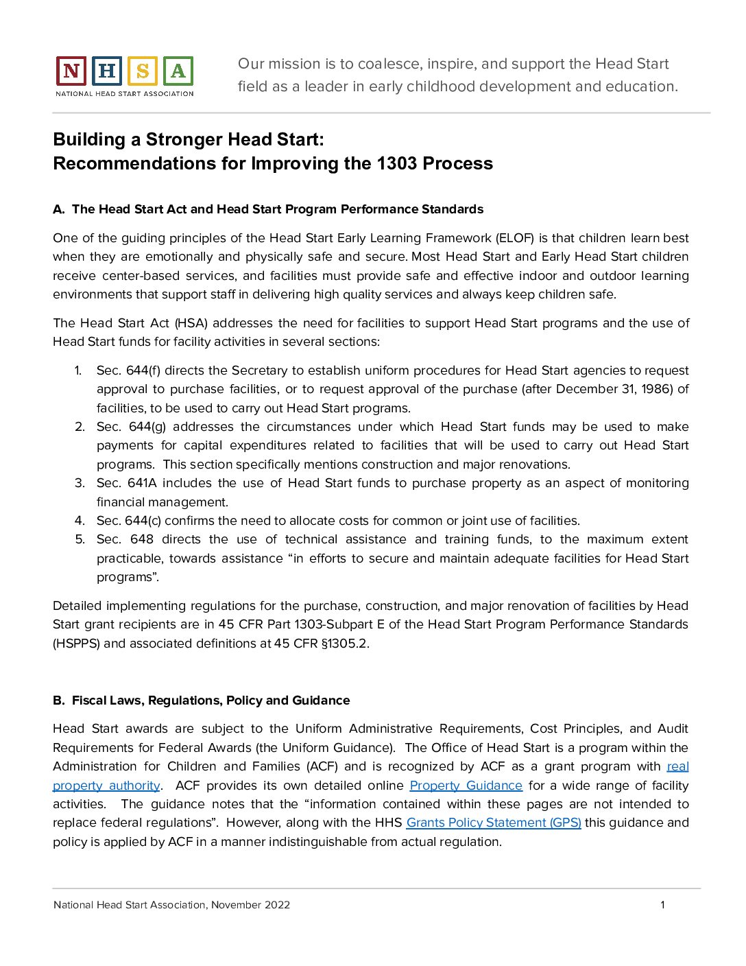 Over the past several months, we have consistently heard about the many challenges programs face when they request to use federal funding for renovation, purchase or construction of facilities (aka the 1303 process). After several weeks of research and discussions, NHSA is pleased to send a report “Building a Stronger Head Start: Recommendations for Improving the 1303 Process” to OHS Leadership which outlines NHSA’s recommendations about how to improve the 1303 process.