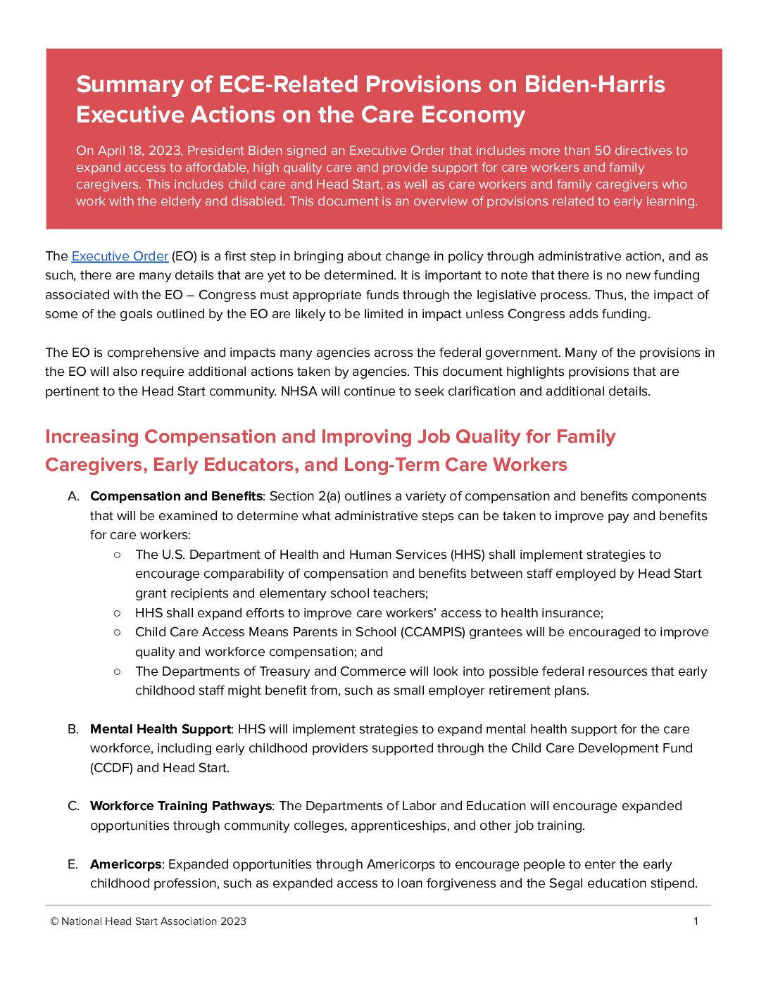 The EO is comprehensive and impacts many agencies across the federal government. Many of the provisions in the EO will also require additional actions taken by agencies. This document highlights provisions that are pertinent to the Head Start community. NHSA will continue to seek clarification and additional details.