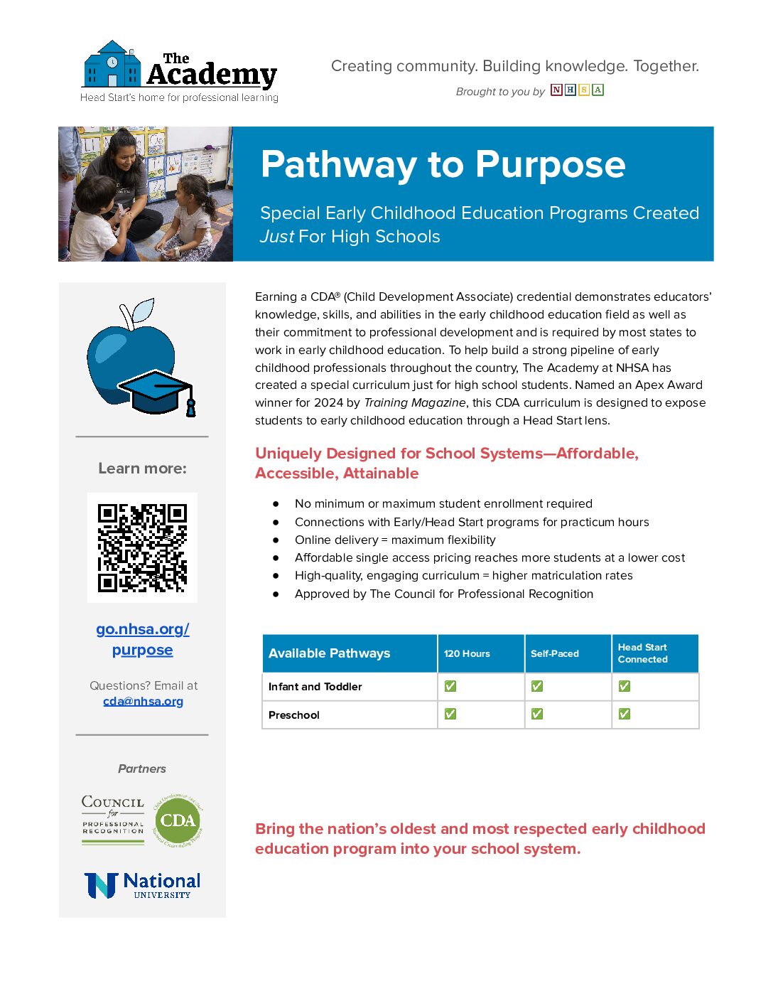 In partnership with Harmony, The Academy at NHSA is proud to introduce CDA Pathway To Purpose—a program that allows high school students to access The Academy at NHSA’s CDA coursework at no cost!