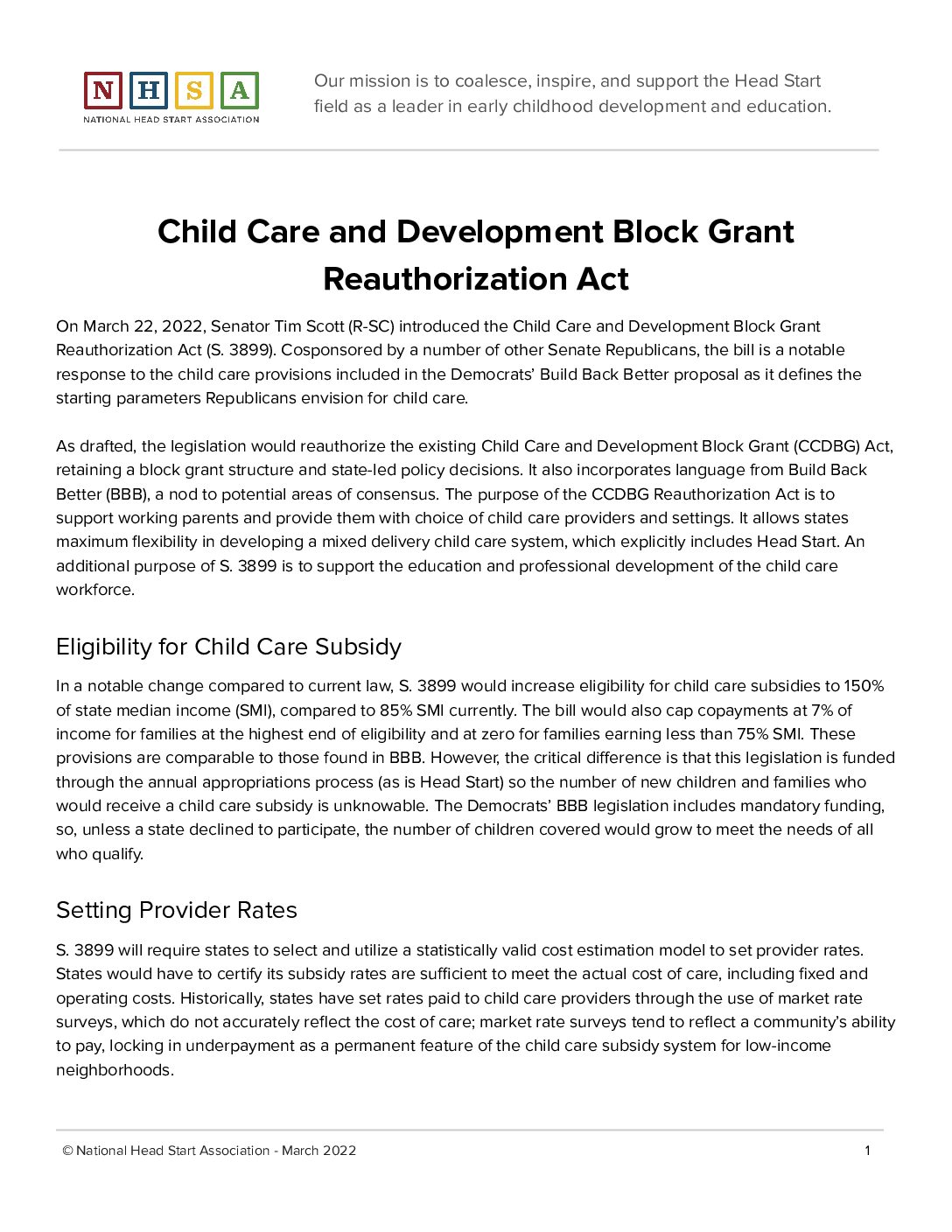 On March 22, 2022, Senator Tim Scott (R-SC) introduced the Child Care and Development Block Grant Reauthorization Act (S.3899). Cosponsored by a number of other Senate Republicans, the bill is a notable response to the child care provisions included in the Democrats’ Build Back Better proposal as it defines the starting parameters Republicans envision for child care. As drafted, the legislation would reauthorize the existing Child Care and Development Block Grant (CCDBG) Act, retaining a block grant structure and state-led policy decisions. It also incorporates language from Build Back Better (BBB), a nod to potential areas of consensus.