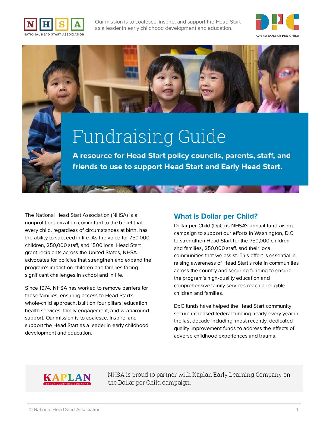 The Fundraising Guide is a resource for Head Start Policy Councils, parents, staff, and friends to use to support advocacy for Head Start and Early Head Start. This document will provide you with helpful resources and information to create your own Dollar per Child campaign, including a walk through the fundraising year, event ideas, guidelines to consider while you fundraise, special tips from Head Start Policy Councils, and more!