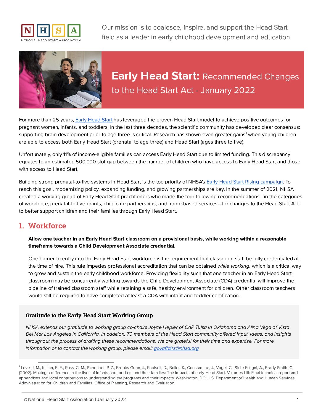 Building strong prenatal-to-five systems in Head Start is the top priority of NHSA’s Early Head Start Rising campaign. To reach this goal, modernizing policy, expanding funding, and growing partnerships are key. In the summer of 2021, NHSA created a working group of Early Head Start practitioners who made the four recommendations—in the categories of workforce, prenatal-to-five grants, child care partnerships, and home-based services—for changes to the Head Start Act to better support children and their families through Early Head Start.