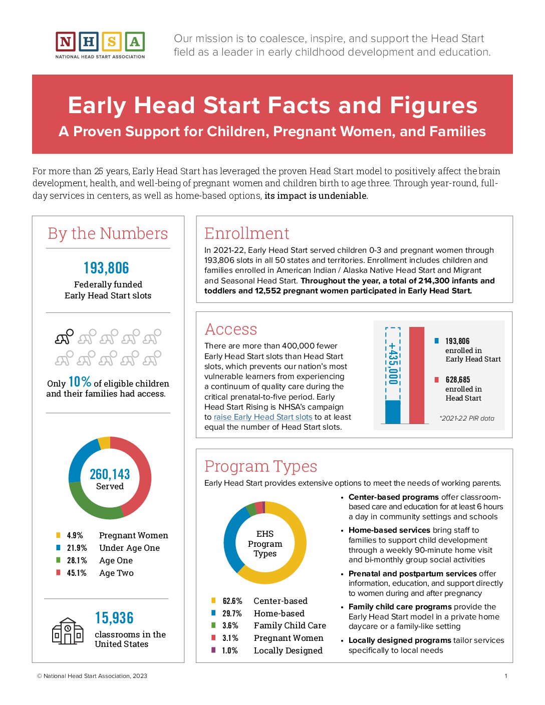 NHSA’s newest resource lays out the scope of Early Head Start’s work, highlighting the importance of expanding these critical services. Download our Early Head Start Facts and Figures and learn more about Early Head Start’s service delivery models, how programs support families’ comprehensive needs, and how the Early Head Start promotes equity.