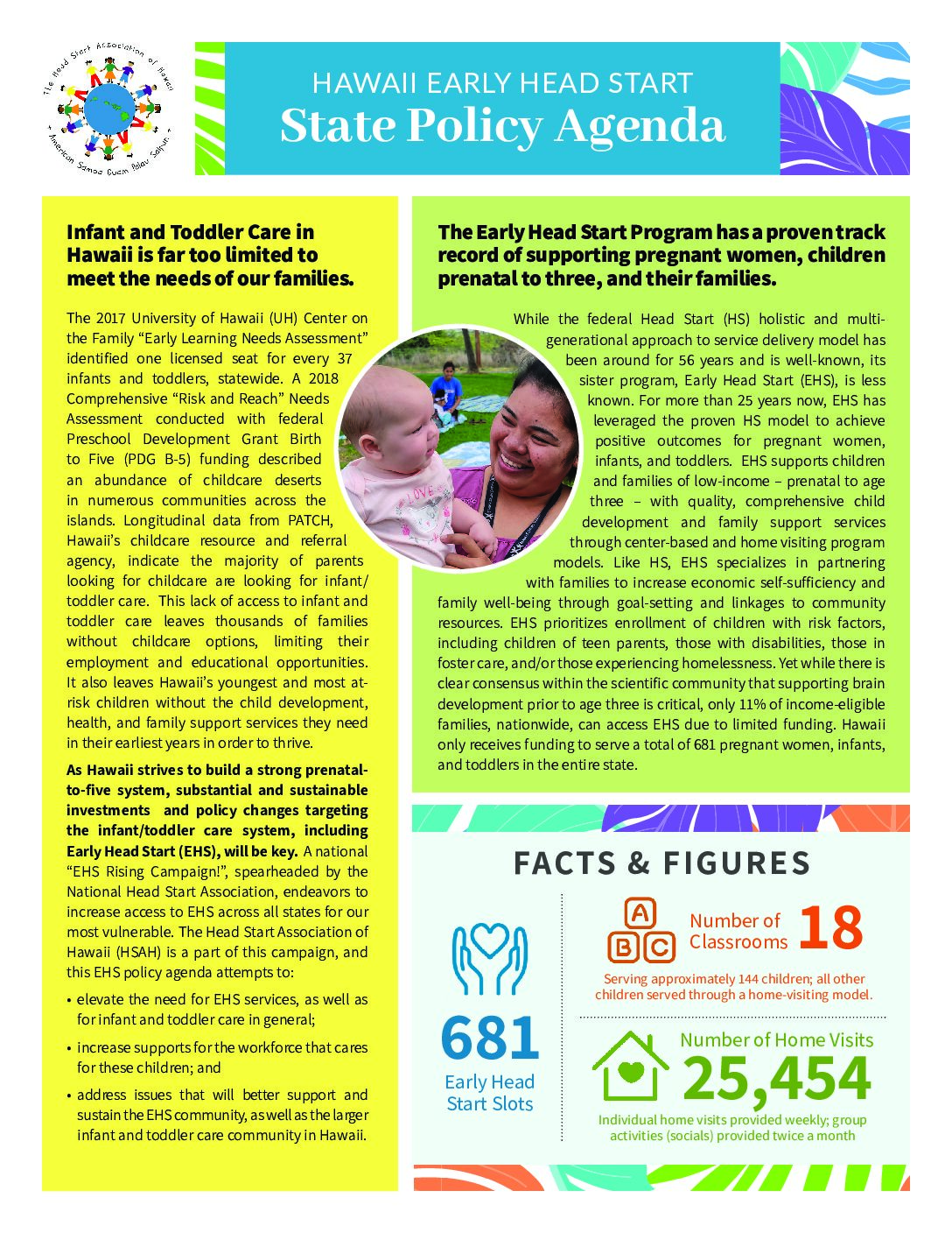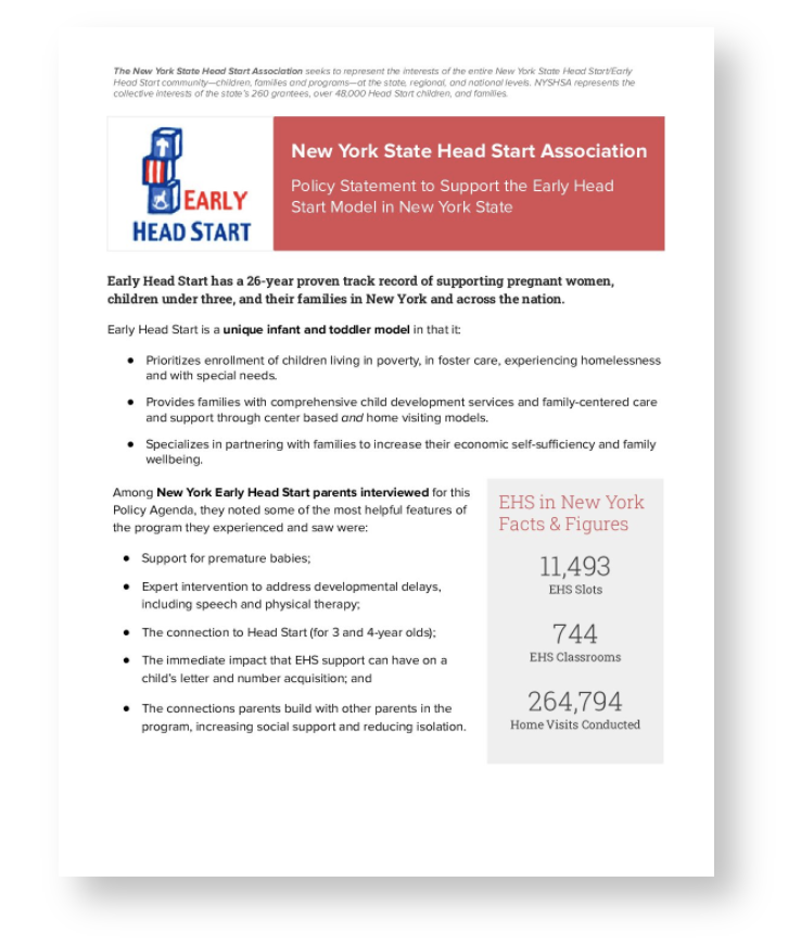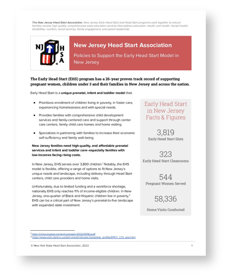 State policy is critical to expanding access to Early Head Start, whether through sensible licensing regulations, infant/toddler workforce supports, or facilitation of child care partnerships. Earlier this month, NHSA hosted a convening of 20 prenatal-3 coalitions and state Head Start associations to discuss opportunities and the Early Head Start Rising campaign. Since then, Maryland, New Jersey, and New York Head Start Associations have developed Early Head Start state policy agendas specific to their unique state needs and context.