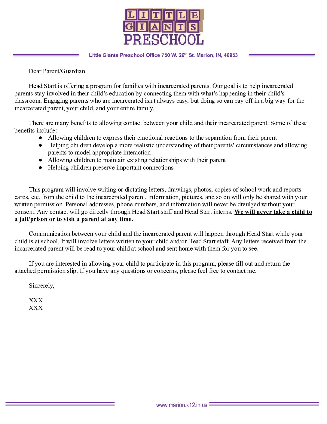 First, we send a letter to the parent or guardian at home about our Incarcerated Parent Program and seeking their permission to participate. The letter highlights the value the program brings children to be connected with their incarcerated parent. We share the following benefits: