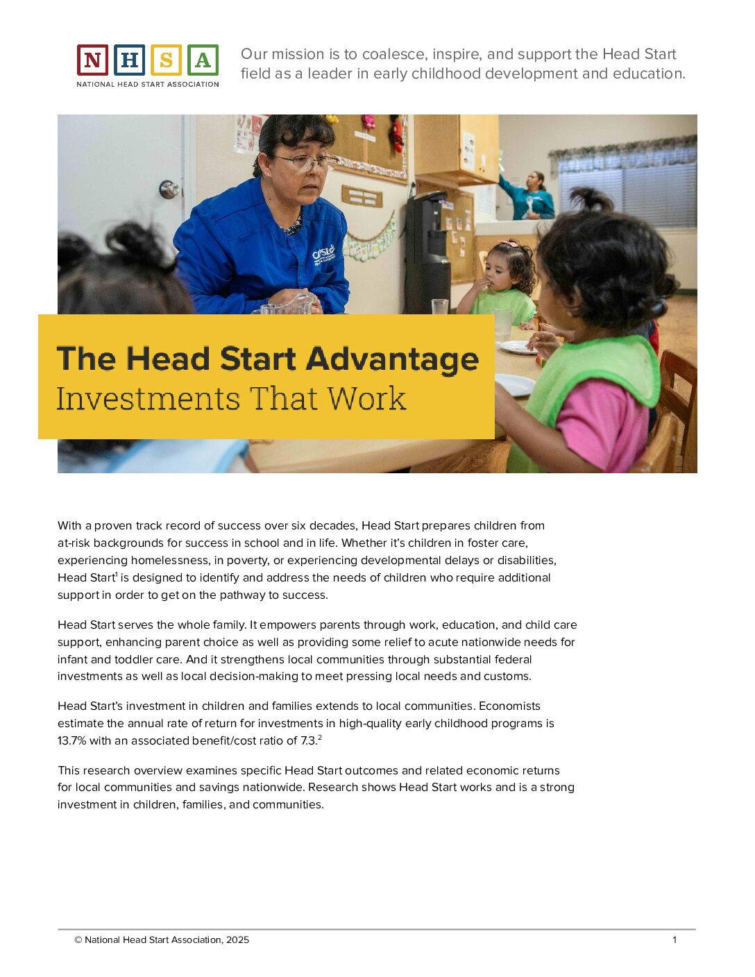 This research overview examines specific Head Start outcomes and related economic returns for local communities and savings nationwide. Research shows Head Start works and is a strong investment in children, families, and communities.