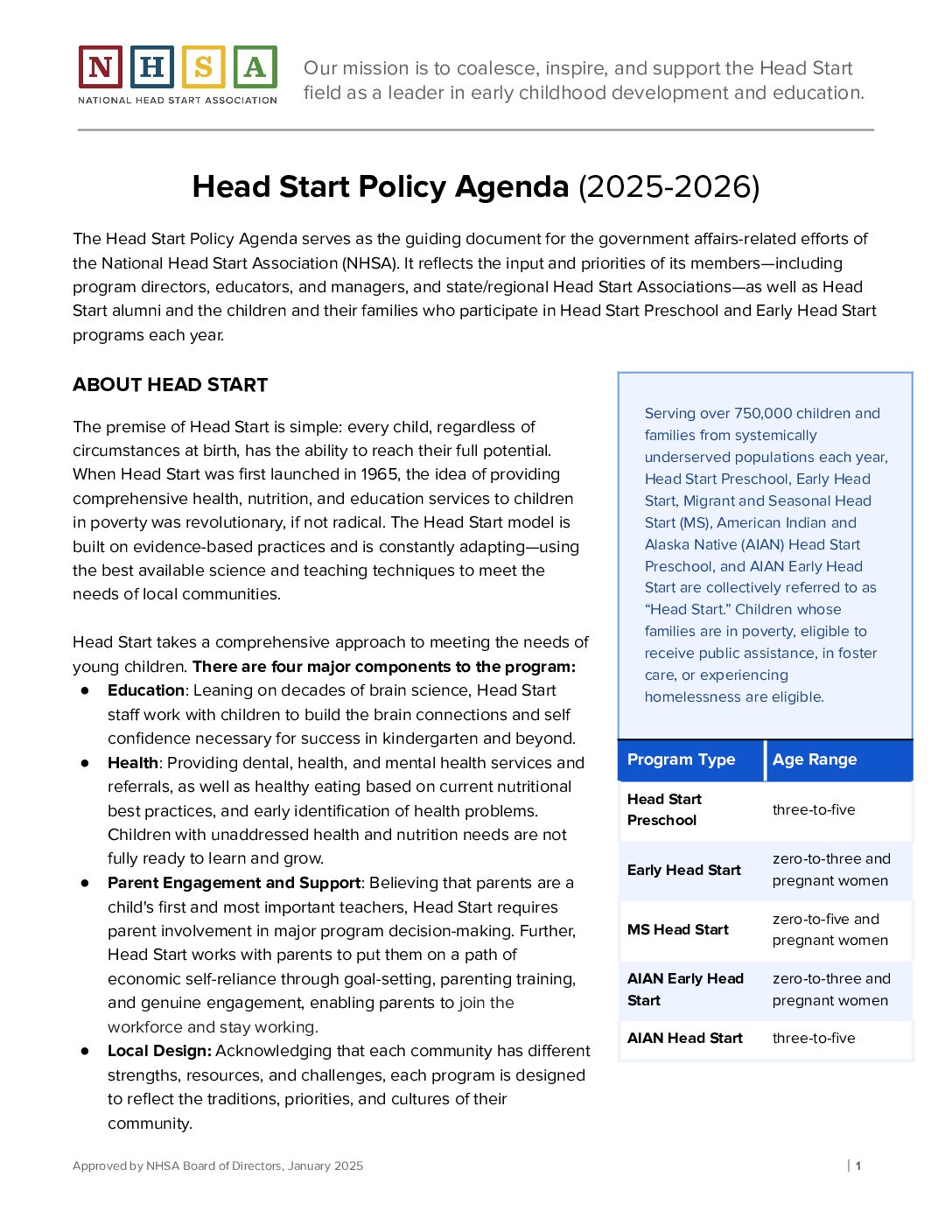 The national Head Start Policy Agenda serves as the guiding document for the National Head Start Association’s government affairs-related efforts. Based on the needs and feedback of the Head Start community, the agenda provides a roadmap for NHSA’s policy engagement and informs advocacy for changes in current law, regulation, and practice. These recommendations are pursued independently and collectively, and in consultation with local Head Start practitioners and Head Start families.