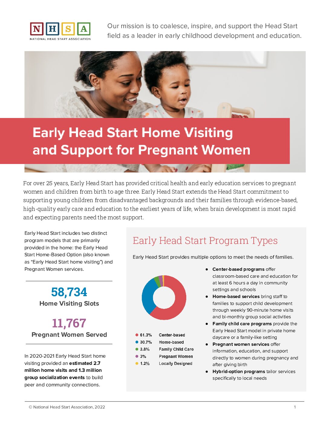 Early Head Start home visiting provides services in the home to vulnerable children and families, connecting pregnant women and their families to prenatal care, fostering strong parent-child relationships, and supporting the role of parents as their children’s first and primary teachers. One-third of all Early Head Start slots are designated home-visiting or prenatal services.