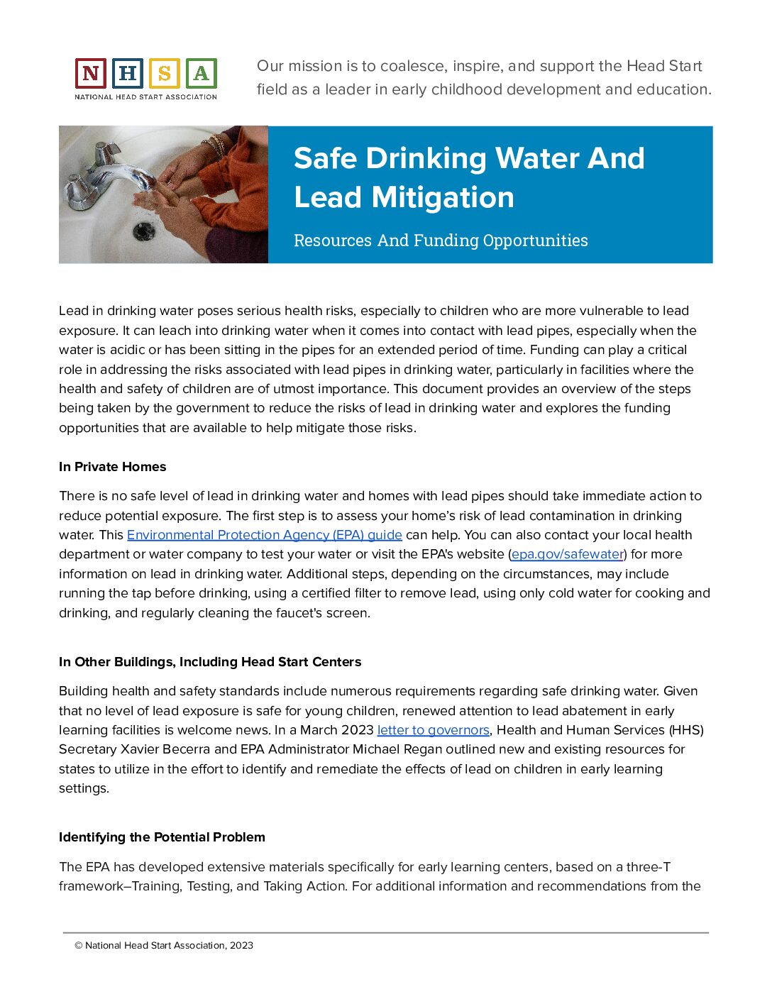 Building health and safety standards include numerous requirements regarding safe drinking water. Given that no level of lead exposure is safe for young children, renewed attention to lead abatement in early learning facilities is welcome news. In a March 2023 letter to governors, Health and Human Services (HHS) Secretary Xavier Becerra and EPA Administrator Michael Regan outlined new and existing resources for states to utilize in the effort to identify and remediate the effects of lead on children in early learning settings.